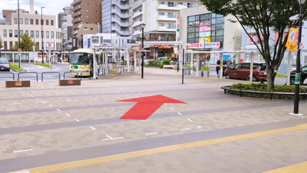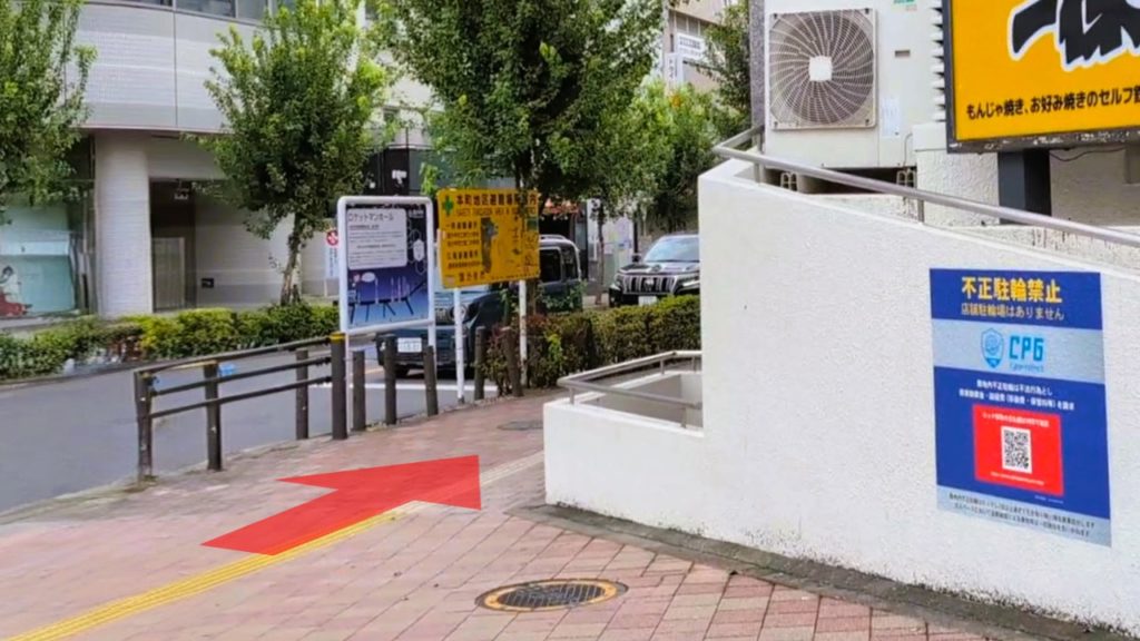 4. 階段を降りると、目の前に広場がございます。矢印の方向へお進みください。
